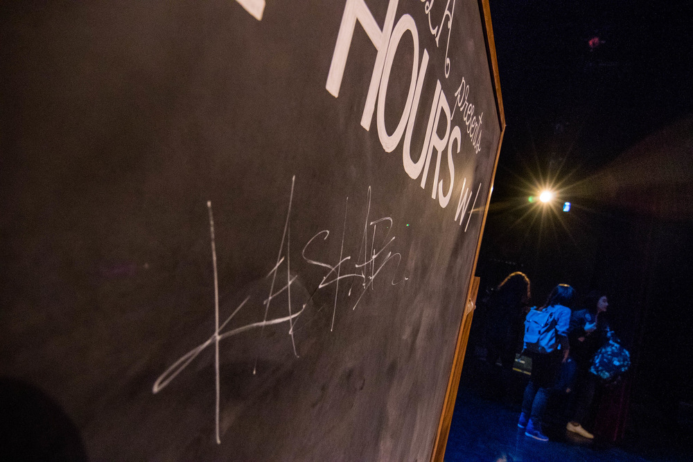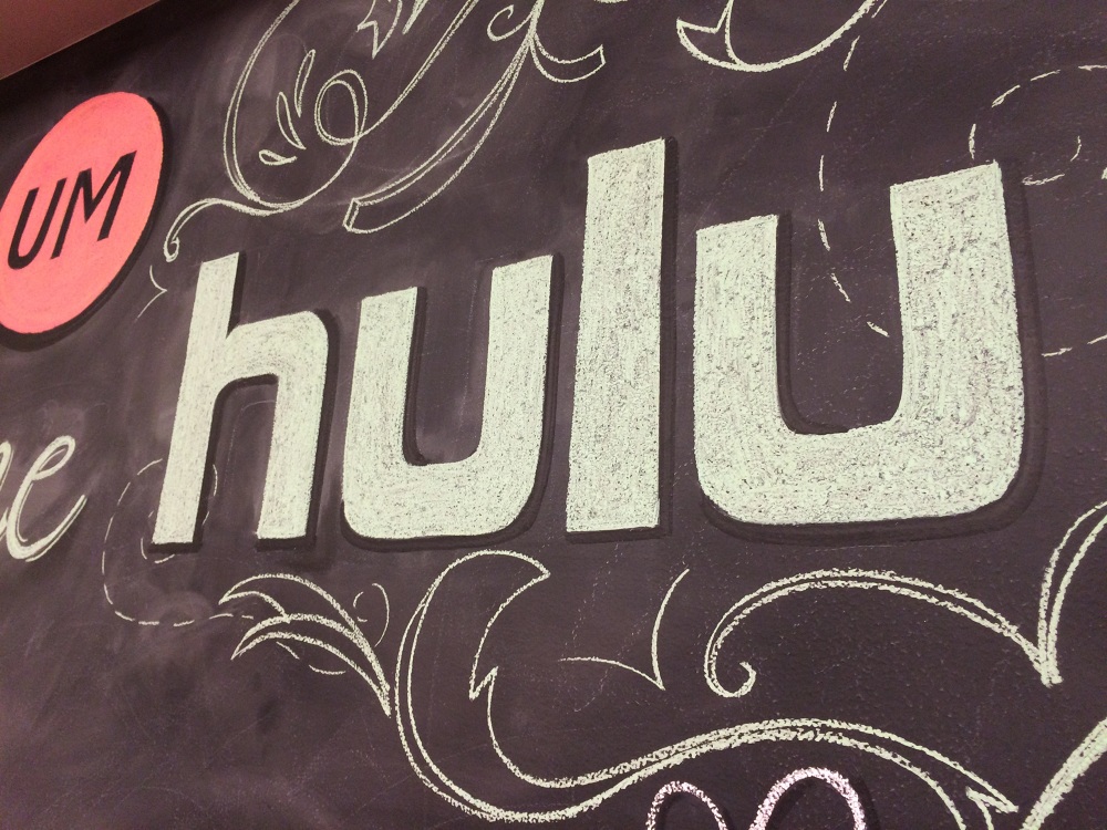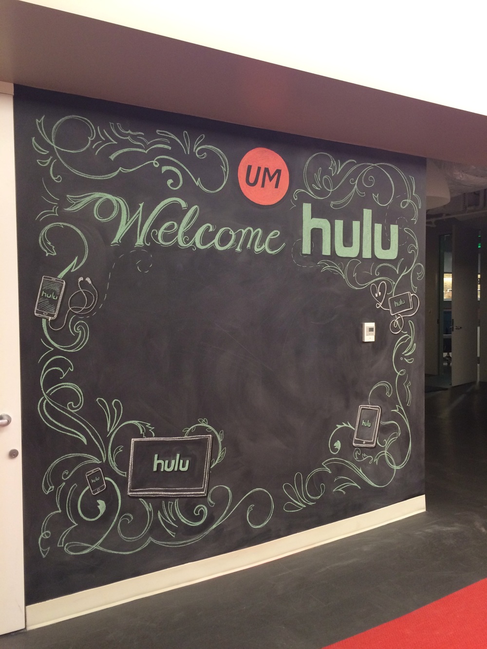 Hulu in the main entrance at their Los Angeles location. I freehanded the art using traditional green chalk and accented the devices in white which also featured Hulu's logo on each device. There was a nice stylistic balance of classic filigree and contemporary tech devices. The center of the piece was left intentionally blank for the guests to leave their mark on this signature wall.